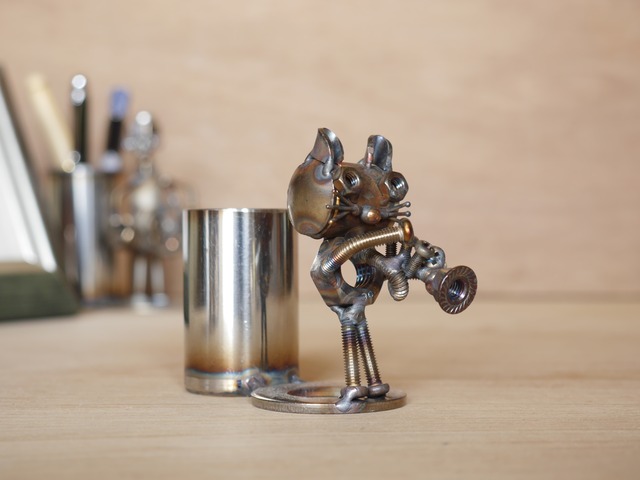 トランペット猫ロボット ボルトナットのミニねこバンドロボット ペン立て印鑑入れ