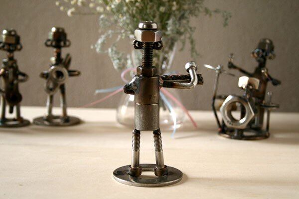 ボルト*ナットのフルートを演奏するロボットオブジェ。