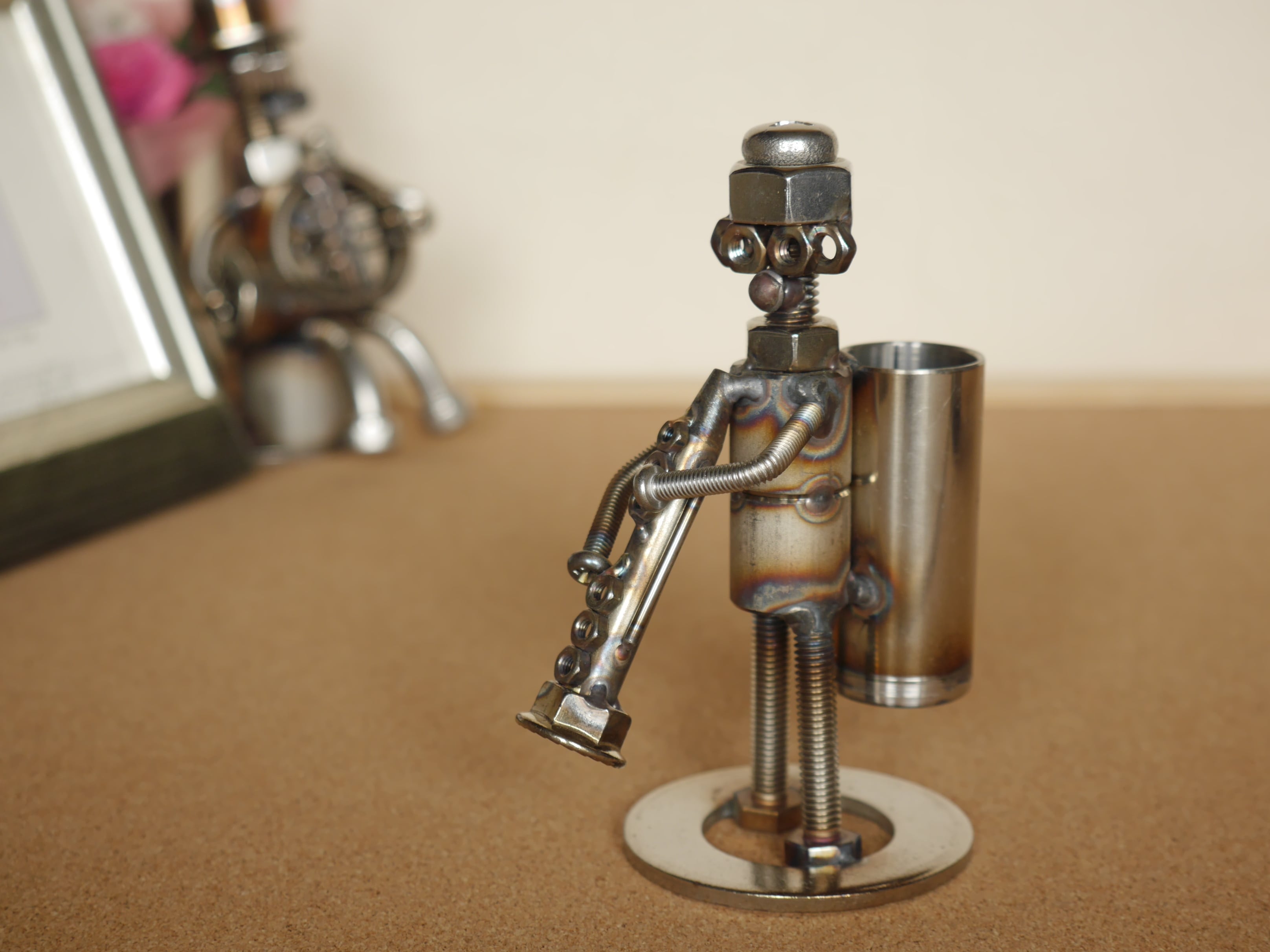 ステンレス製ボルトナットの楽器を演奏するバンドロボット。