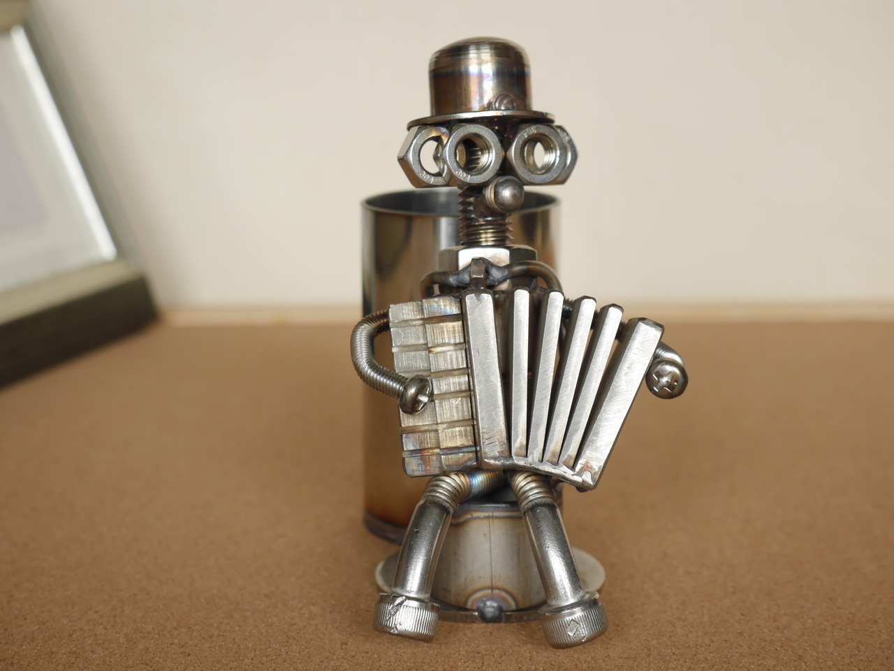 ステンレス製の楽器を演奏するピアノアコーディオンロボット。