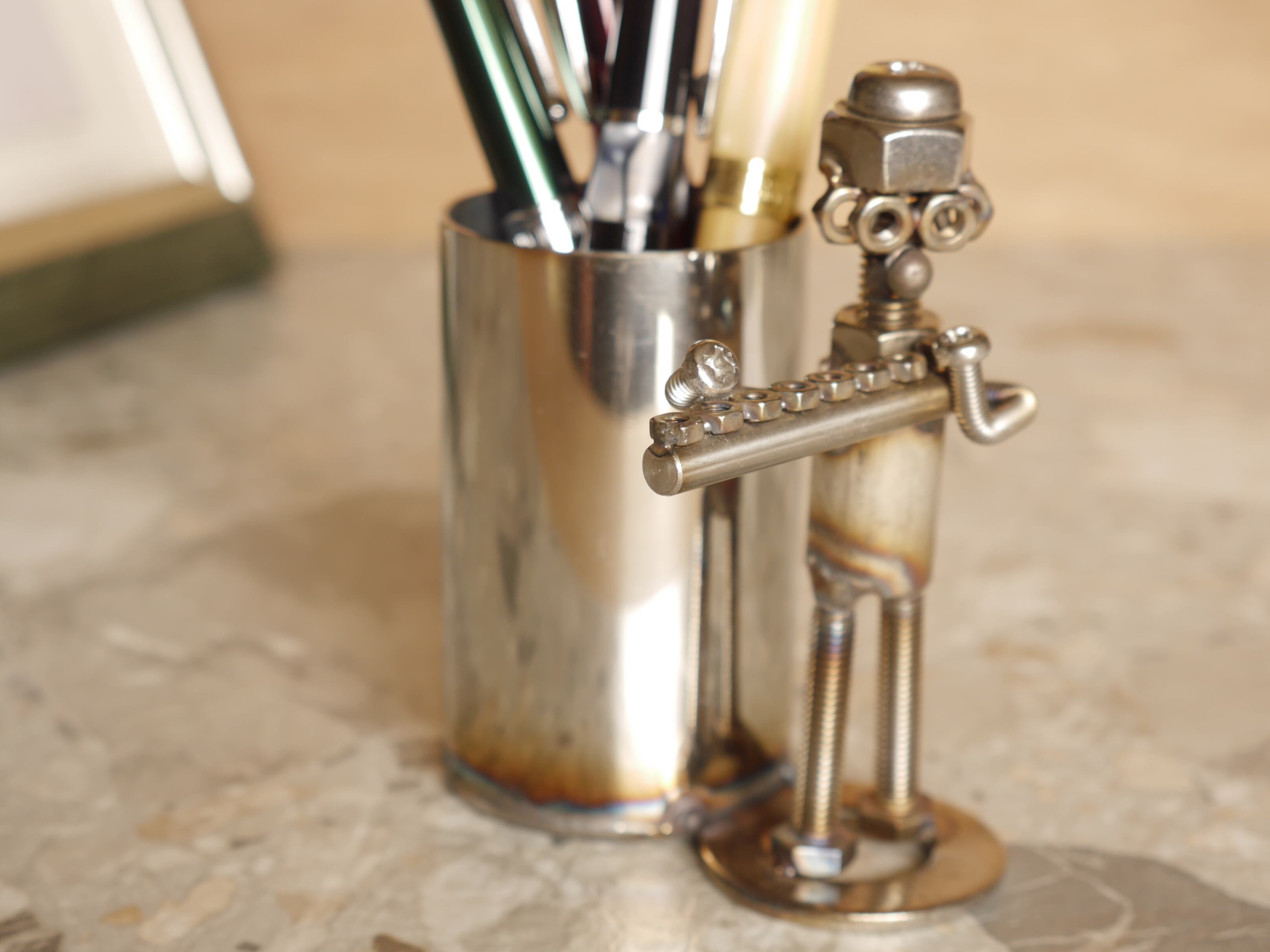 ステンレス製ボルトナットの楽器を演奏するロボット。
