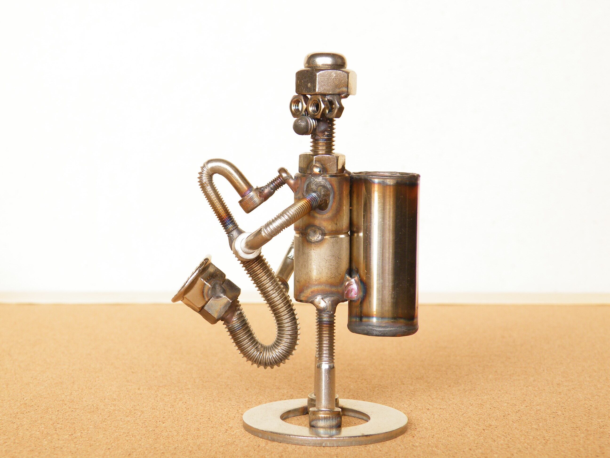 ステンレス製ボルトナットの楽器を演奏するバンドロボット。